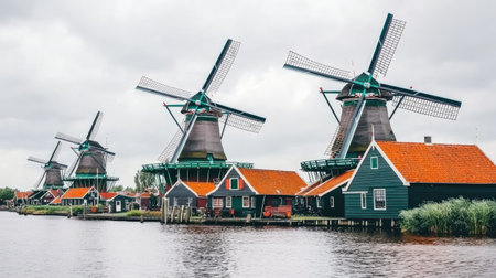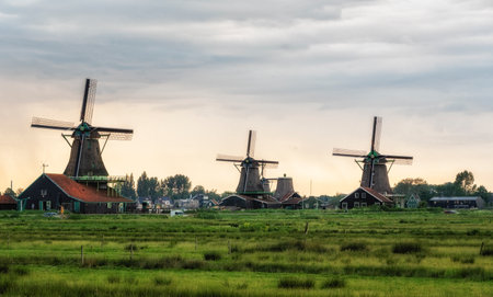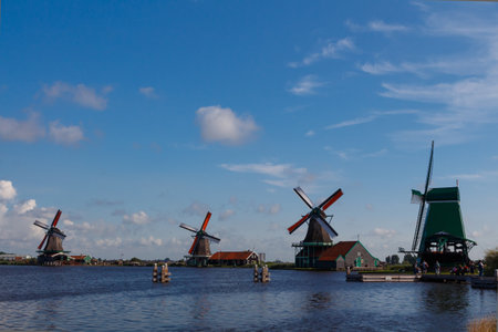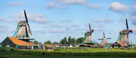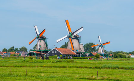 Traditional Dutch windmills in the rural landscape of Zaanse Schans, The Netherlands