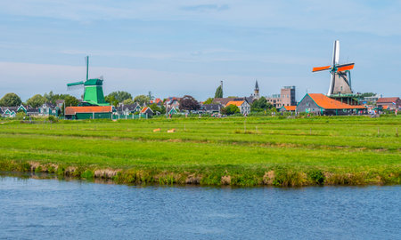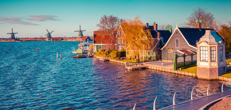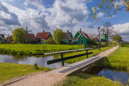 Panorama of the tipical Dutch village Zaanstad in spring sunny day. Netherlands, Europe.