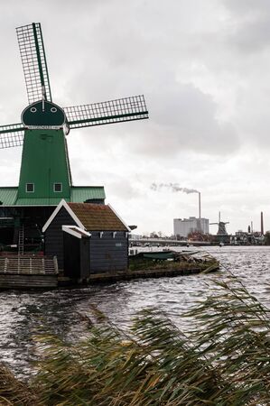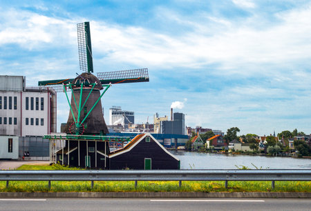Zaandam, Holland - July 25, 2014: Waterland district, a mill in front of the industrial area
