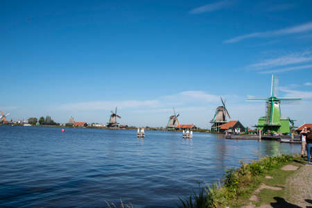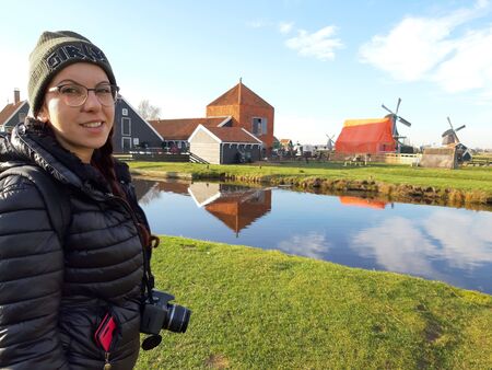 caucasian tourism in the netherlands. the traditional landscape of windmills on the canals of Zaanse Schans