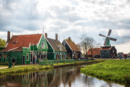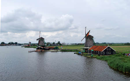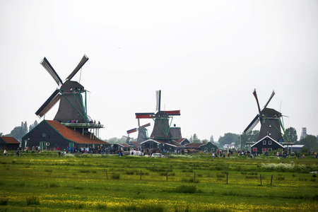 Netherlands, Zaanse Schans - April, 24, 2017: Windmill and the landscape around in a cloudy day in Zaanse Schans in 2017