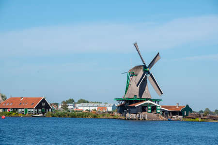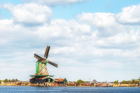 Dutch close up scenery with windmill of Zaanse Schans over river water at spring day, Netherlands