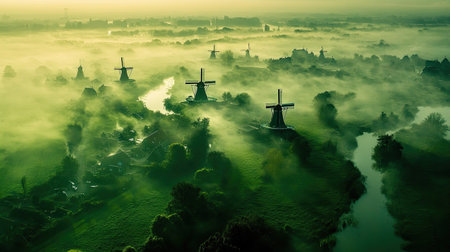 A tranquil scene showcasing lush green fields and iconic windmills shrouded in morning fog, complemented by a calm river reflecting soft sunlight.