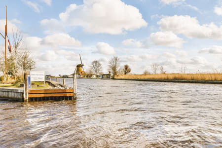 A beautiful country scenery of windmills at the river shore under the cloudy sky