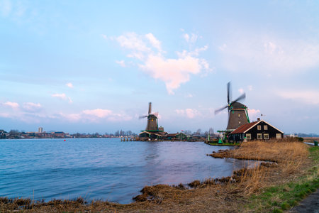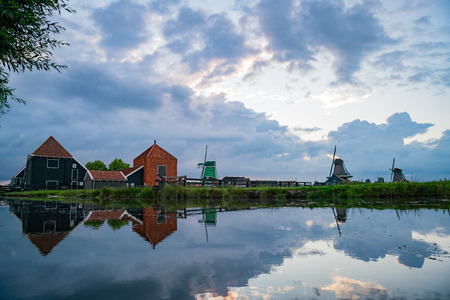 Historical buildings and windmills at dusk in Zaanse Schans, Netherlands