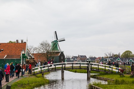 Amsterdam, Netherlands - April 19, 2017 : Scene of Dutch village with Windmill and bridge, Nice travel destination in Zaanse Schans.