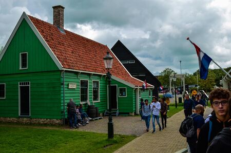 Zaanse Schans, Netherlands - 1 October 2019: Tourists sightseeng traditional Dutch rural houses in Zaanse Schans, is a typical small village within Amsterdam area.