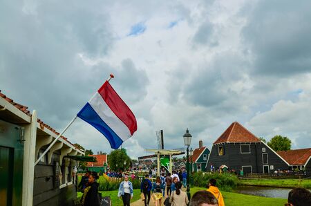 Zaanse Schans, Holland, August 2019. Northeast Amsterdam is a small community located on the Zaan River. Seen between the pretty wooden houses, the Dutch flag frames. Very charming.