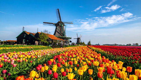 Colorful tulips and windmills in Zaanse Schans, Netherlands