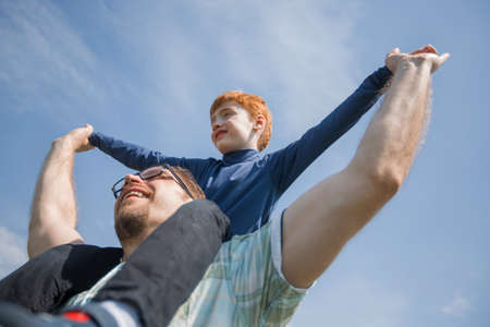 Portrait of father holding his son on a shoulders and his friend outdoors