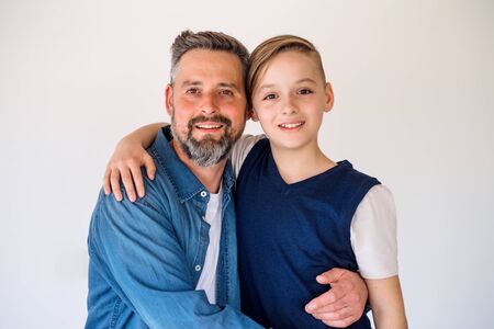 An elderly father and young son posing in a studio. They are hugging and smiling