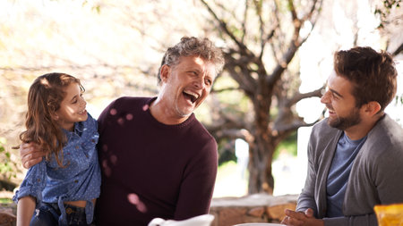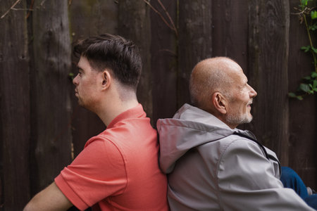 Happy senior father with his young son with Down syndrome sitting and having fun in park.