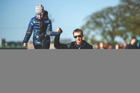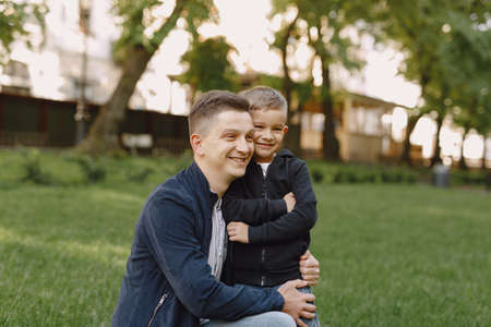 Caucasian father playing with happy little son, enjoying autumn garden outdoor. Fun family. Happy family, childhood. Carefree childhood. Family relationship concept
