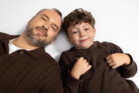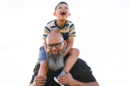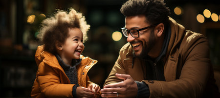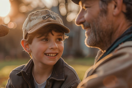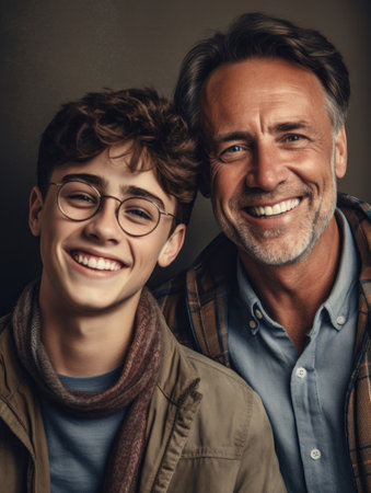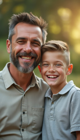 A beaming father and his young son share a moment of pure joy, surrounded by a soft, golden glow of sunlight. Their genuine smiles radiate happiness and love, capturing the essence of a cherished bond between generations.