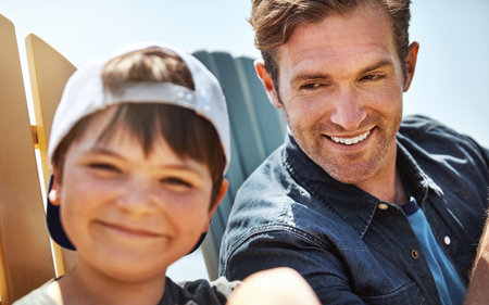 A man and a young boy are seated closely next to each other, engaging in conversation or observing their surroundings. The two individuals appear comfortable and are possibly sharing a moment of bonding or relaxation.