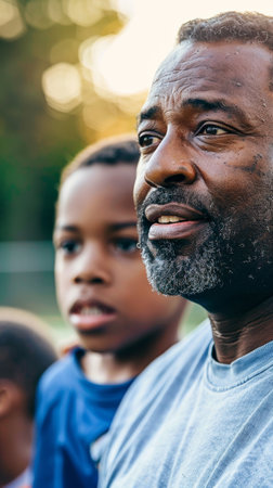 A close-up portrait of a man and boy, possibly father and son, intently watching an outdoor event. The man, with a graying beard, gazes thoughtfully, while the boy, with a bright blue shirt, stars with anticipation. The scene suggests a shared moment of excitement and connection between them.