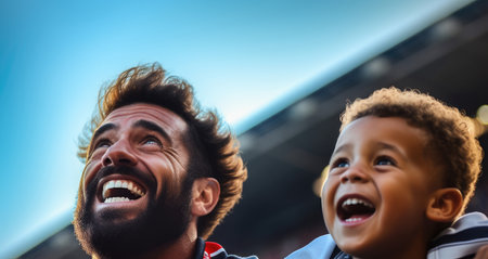 Happy father and son in stands at rugby soccer stadium, Moment passion for rugby unites generations and ignites sense of shared triumph.