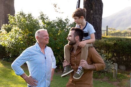 Front view of a Caucasian man at home in his garden, standing with his young son sitting on his shoulders, his senior father, standing beside them smiling with his hands on his hips, the father and son both smiling at the granddad
