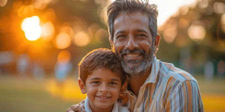 Father and son smiling warmly in the golden sunshine outdoors in India.