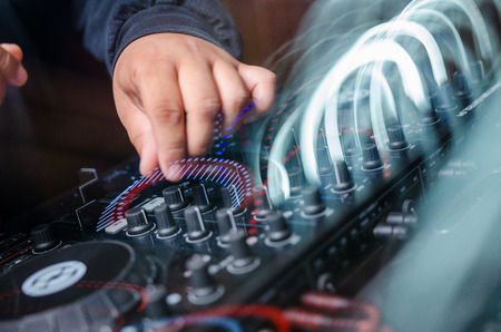 hands of the DJ on the background of the mixer