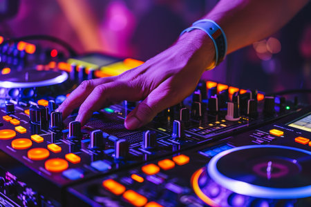 Closeup of a dj's hand adjusting sound equipment with vibrant lighting