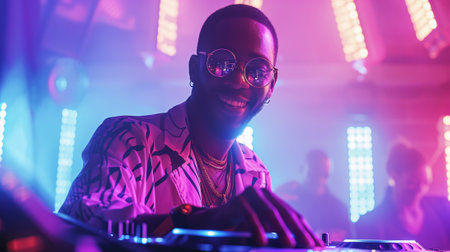 DJ skillfully spinning records with neon lights illuminating the atmosphere