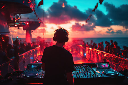 Hip hop man mixing music on dj's deck at a beach party