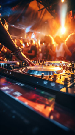 A DJ is seen manipulating a turntable and mixing console during an event. The close-up view highlights the hands interacting with the equipment. The scene features warm tones and a shallow depth of field, with a blurred crowd in the background. The image could be used for various commercial or editorial purposes.