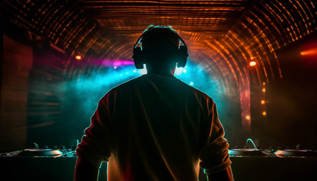 DJ player audio mixing electronic music in a nightclub party Created with Generative AI technology.