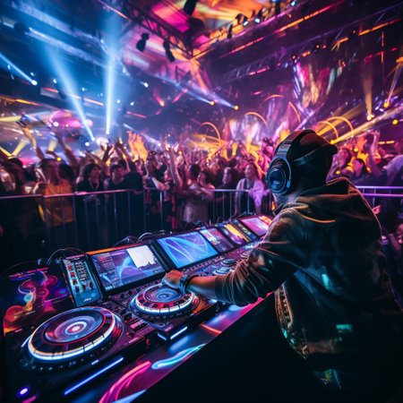 A DJ skillfully mixes music on a professional soundboard in a vibrant nightclub setting, capturing the energy and excitement of live electronic music performances.