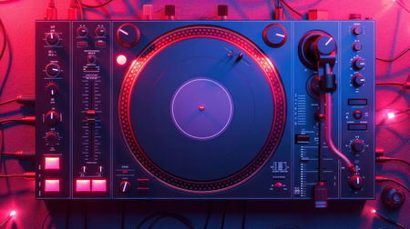 DJ equipment with blue neon lights ready for a night party.Generative AI.