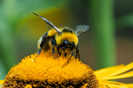 Big bumblebee with yellow black stripes and textured wings. Bumblebee close up sitting on a yellow purple flower blue cow wheat. Macro, blurred background.
