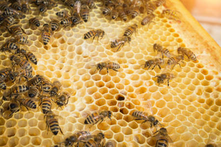 Close up view of the working bees on the honeycomb with sweet honey. Honey is beekeeping healthy produce.