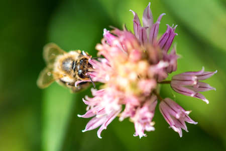 Bee on the flower. Small useful insect is working and making honey. Honeybee with wing on the blossom. Spring at countryside of meadow.
