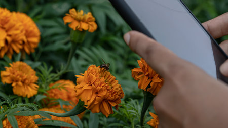 Close-up of a man's hand holding a mobile phone with orange flowers