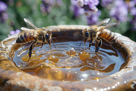 Bees drink from a water-filled honey bowl. Two bees drink honey from a filled bowl nestled in a blooming lavender field.