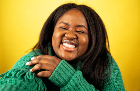 image of a beautiful woman posing in casual clothes on a yellow background