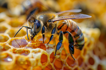 Detailed macro shot of a honeybee showcasing intricate features like wings and body. This insect plays a vital role in pollination and ecosystem health.
