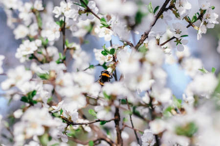 Bumblebee sits on a branch of a flowering tree. White cherry flowers. Green leaves of a tree. Bumblebee near. Bumblebee collects nectar. Wild bumblebee. White spring flowers. Flowers on a tree. Spring sunny day