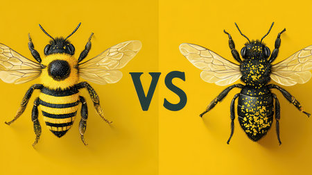 A vibrant and detailed illustration showcasing a yellow bee and a black bee, highlighting the beauty and diversity of insects against a bright yellow background.